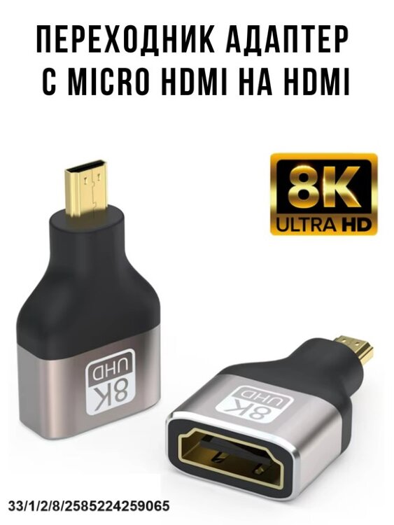 Переходник адаптер 8К c Micro HDMI на HDMI позволит транслировать видео и звук с современных гаджетов с разъёмом Micro-HDMI на мониторе или телевизоре.